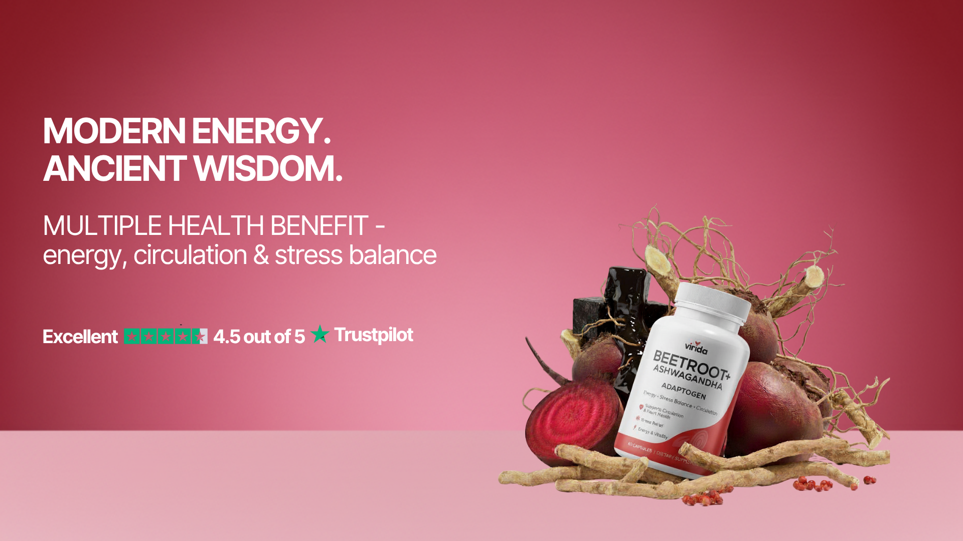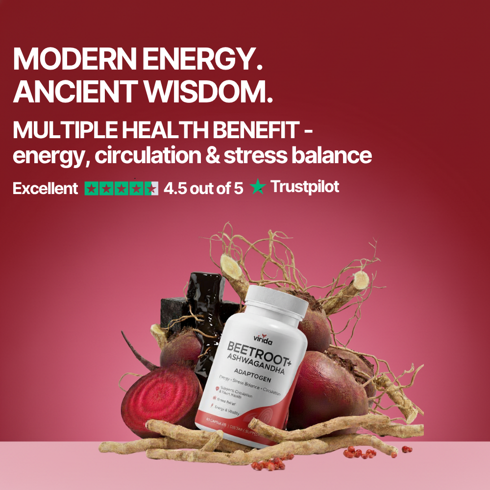Virida Beetroot + Ashwagandha is a dietary supplement designed for adults who want to support healthy circulation, manage stress naturally, and enhance energy and vitality as part of their daily wellness routine.
